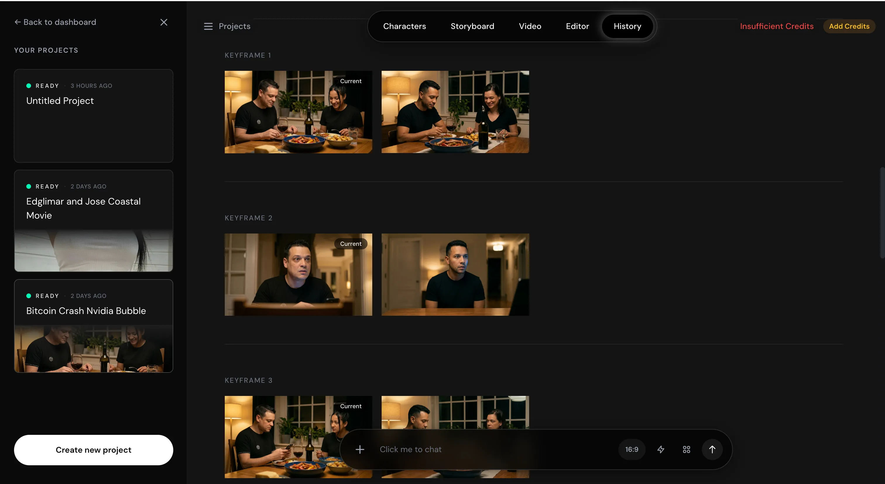The main screen looks like ChatGPT or any typical chatbot interface. From there, you navigate five tabs: Characters, Storyboard, Video, Editor, and History.